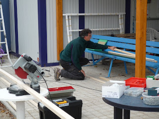 Traditionen wollen gewahrt sein. Wenn wir schon ein Dach aufschlagen, muss es auch ein Richtfest geben. Sogar mit Richtbaum, gesponsort von Emma. Spontan lud Jürgen dazu ein und brachte auch das passende Getränk in der handlichen 3 Liter Flasche mit.