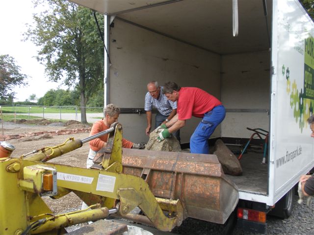 Jetzt begann das große Maleur, denn der 3,5 Tonnen-Bagger konnte den Brocken nicht heben. Also musste der alte Radlader wieder ran. Davon gibt es leider keine Bilder, da der Platzwart selbst diese Millimeterarbeit machen mußte. Der Profikranführer traute sich nicht auf die "alte" Maschine. Es hat toll geklappt.